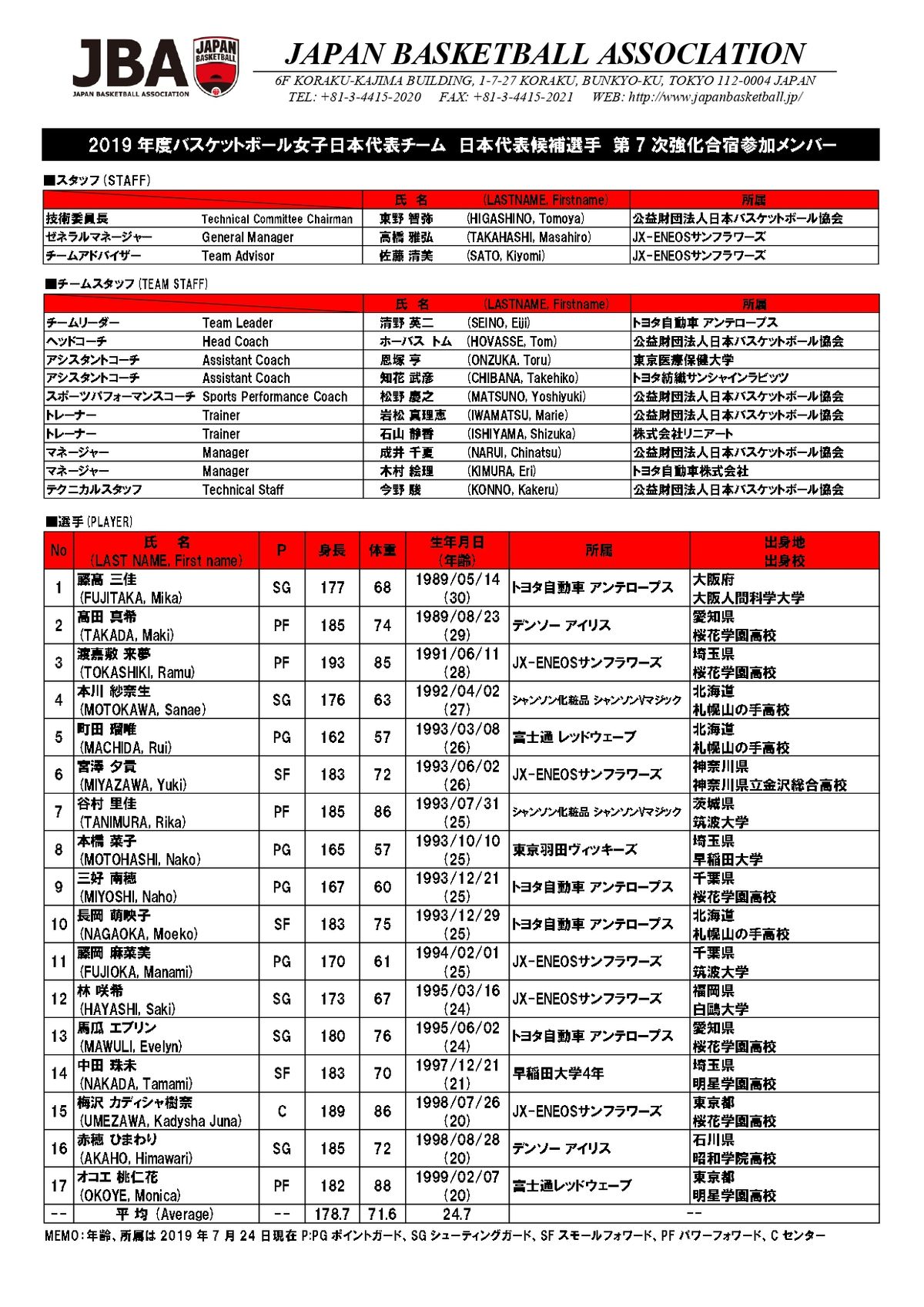 JBAでは、9月24~29日にインド・バンガロールで開催予定の“FIBA女子アジアカップ2019”の4連覇と1年後に迫った「東京2020オリンピック競技大会」へ向けた強化活動の一環として、“2019年度女子日本代表チーム”第7次強化合宿を実施する。