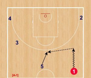 ④と②が両コーナー、③は左ウイング、⑤がトップ、①が右サイドをボールキャリ―しながら5アウトでセカンダリーブレイクへと入っていく。①はセカンドトレーラーの⑤へパスして、このプレーがスタート。