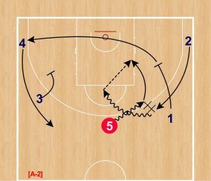 ①はパス後にすぐ②にダウンスクリーン、②はそれを使ってトップへ。①はそのまま反対サイドへカットする。②は⑤とドリブルハンドオフ。②はドライブをして、⑤のダイブへパスをし、得点を決めた。ウィークサイドの③は④へダウンスクリーンを仕掛け、ディフェンスをヘルプに行かせない動きを行っている。