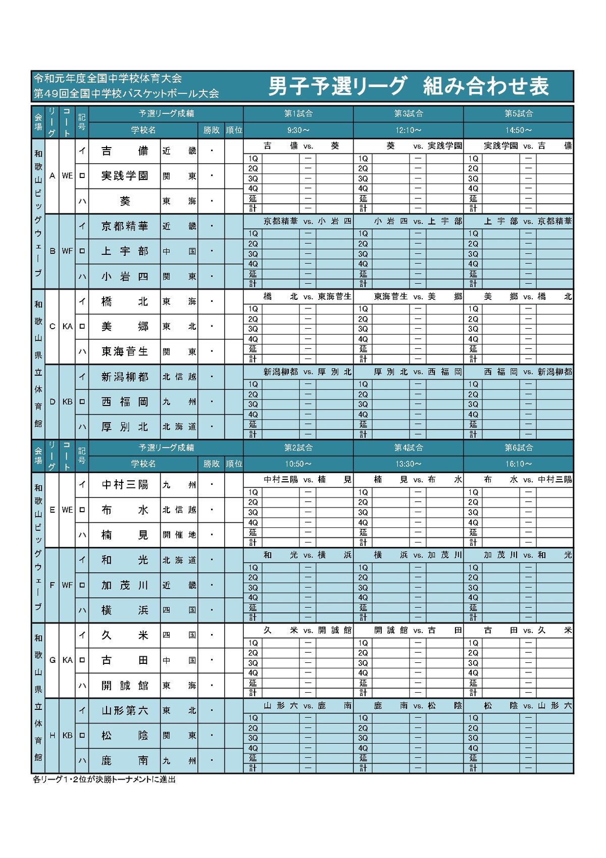 “2019和歌山全中”令和元年度全国中学校総体 第49回全国中学校大会予選リーグ組み合わせ