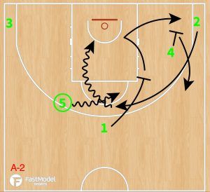 ①はパス後、④とともにスタッガードダウンスクリーンを仕掛け、②はそれを使ってトップへ。それにタイミングを合わせ、⑤とドリブルハンドオフ。①はそのままドライブでシュートを放った。ディフェンスの状況に応じて、ダイブした⑤や両コーナーへキックアウトするパターンもある。
