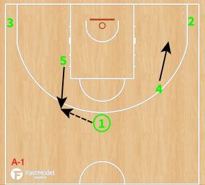 “ホーン”セットで、①がボール保持、③と②が両コーナー、⑤がハイポスト、④が遅れてフロントコートに入ってきた状態から始まる。 ①は⑤へパスし、④はそのまま右コーナーへ向かう。