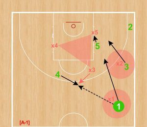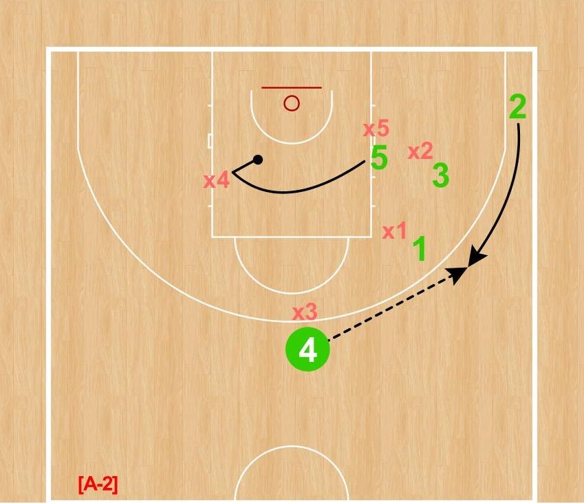 ⑤は左のX4にダックインし、②は右ウイングへ。①と③はスクリーンと同じ効果になり、②はオープンで3Pシュートを放つことができる。また、慌ててX5がチャレンジすれば、②から⑤へフィードしていた。