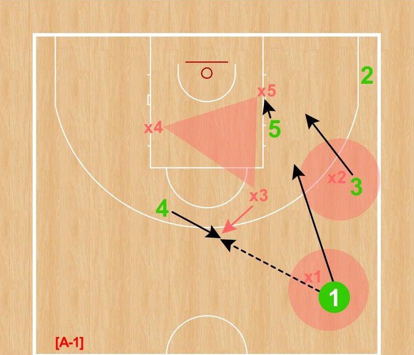 ①がボールキャリー、②が右コーナー、③が右ウイング、⑤が右ミドルポスト、④が左のトップ付近からオフェンス開始(既にオーバーロード状態)。ディフェンスは①にX1、③にX2がマッチアップし、X3・X4・X5でトライアングルを組んでいる(トライアングル&2)。