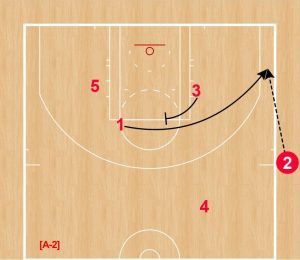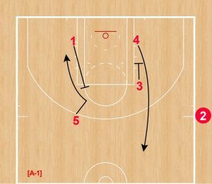 ②がインバウンダー、①と④が両ローポスト、⑤が左の2ガードトップ、③が右エルボーと少し変形のボックスセット。