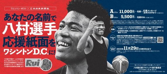 「八村塁応援プロジェクト実行委員会(北日本新聞社、富山県、富山市)」が主催となり、アメリカの「ワシントン・ポスト」と「北日本新聞」にファンから寄せられた応援メッセージを掲載し、八村塁の活躍を後押ししようというプロジェクトが進行中だ。