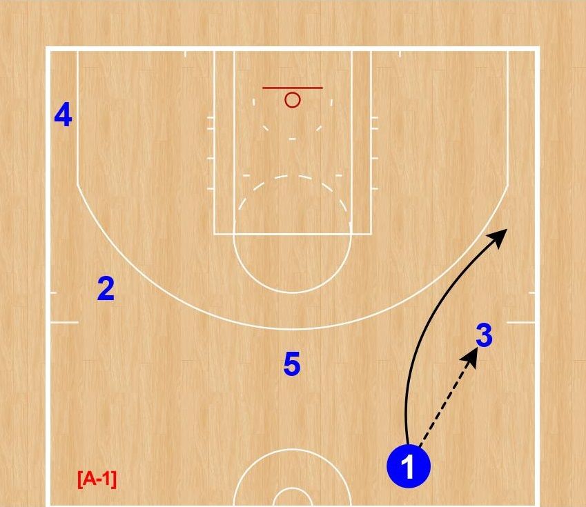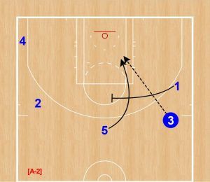 ①は⑤に対してしっかりとスクリーンをセット。⑤はリング方向にダイブし、③からのパスをレシーブしてシュートとなる。シンプルなプレーなので、タイミングが重要となる。