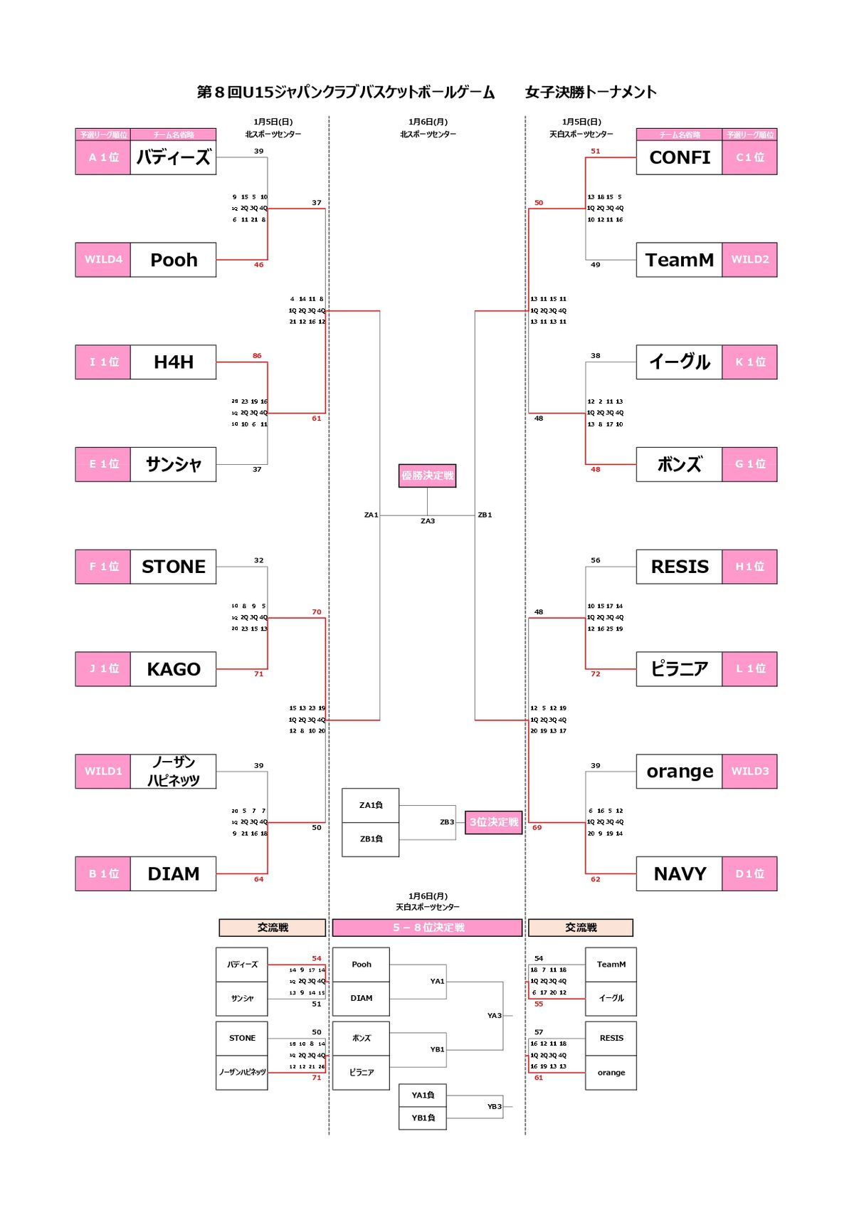 1月4日から開催されている“第8回U15ジャパンクラブバスケットボールゲーム大会(JCBG/旧全国ジュニアバスケットボール選手権大会)の第2日目が終わり、決勝トーナメントを勝ち上がった男女ベスト4が明日の準決勝、決勝に挑む。