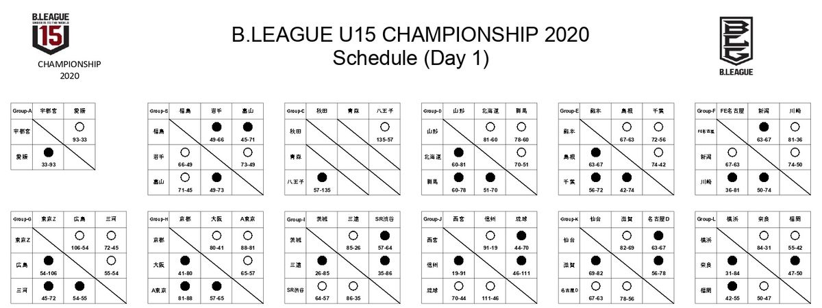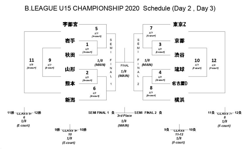 1月6~8日にスカイホール豊田(愛知)で開催される“BリーグU15チャンピオンシップ2020”。初日の予選リーグを終え、宇都宮、岩手、秋田、山形、熊本、新潟、東京Z、京都、SR渋谷、琉球、名古屋D、横浜がブロック1位で通過し、明日からの決勝トーナメントへ駒を進めた。