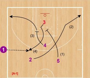 ⑤がカットしてダウンスクリーンをセットし、②がカット、すぐに④もダウンスクリーンをセットする。③はディフェンスの状況を見て、④と⑤のスクリーンの間を通ってボールサイドのトップへ。①からのパスをレシーブして、クイックなターンアラウンド3Pで、劇的な勝利を挙げた。