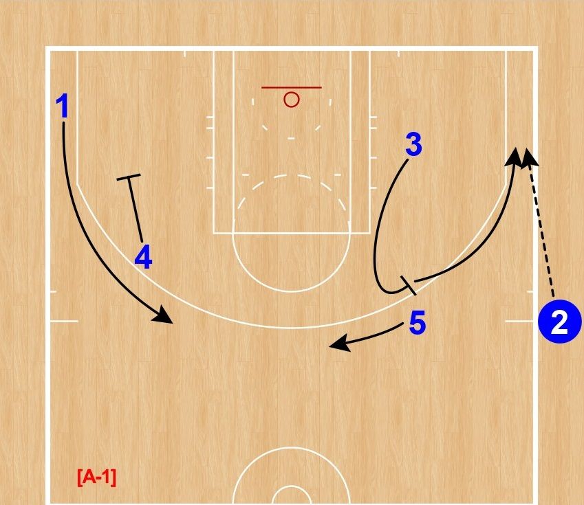 ④は①へダウンスクリーン、③は⑤へフレアスクリーンをセット。①は左ウイング、⑤はトップ方向へカット。①・⑤にディフェンスが引き付けられたところで、③はアフタースクリーンで右ウイングへポップする。そして、②からのインバウンズパスをレシーブしてシュートを狙う(※実際はラインを踏んでターンオーバー…)。