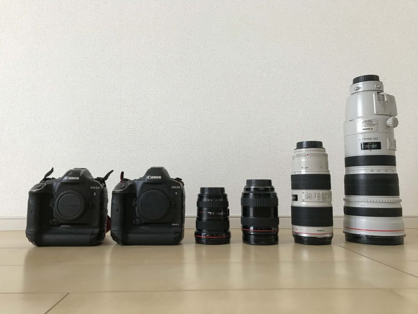 持っていく機材の一部。ボディ2台とレンズ4本の基本セットにPCや着替えなど荷物は多いです