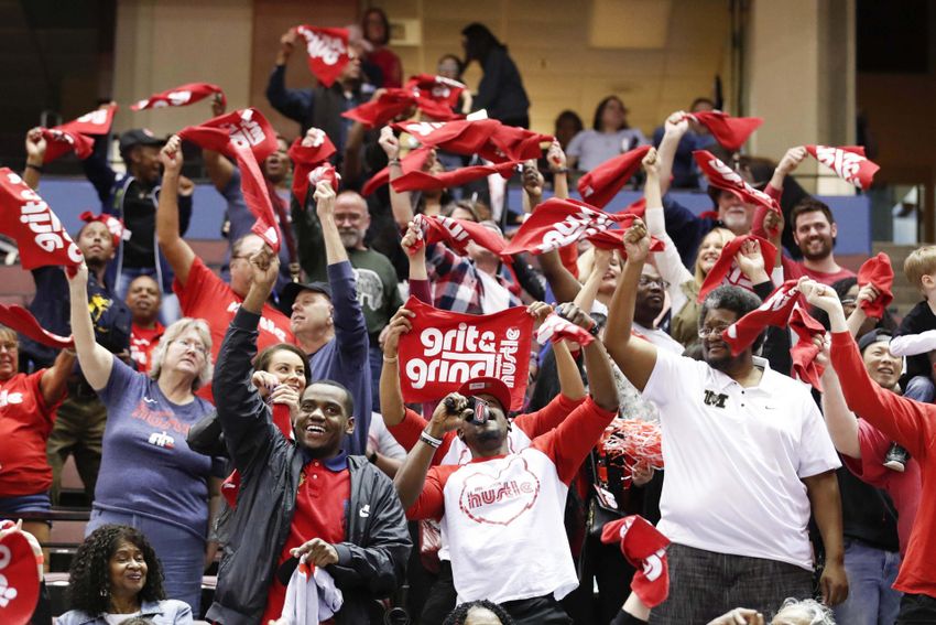 試合の間にタオルを回して盛り上がっているメンフィス・ハッスルのファンたち