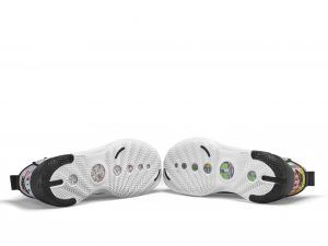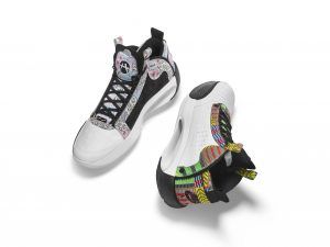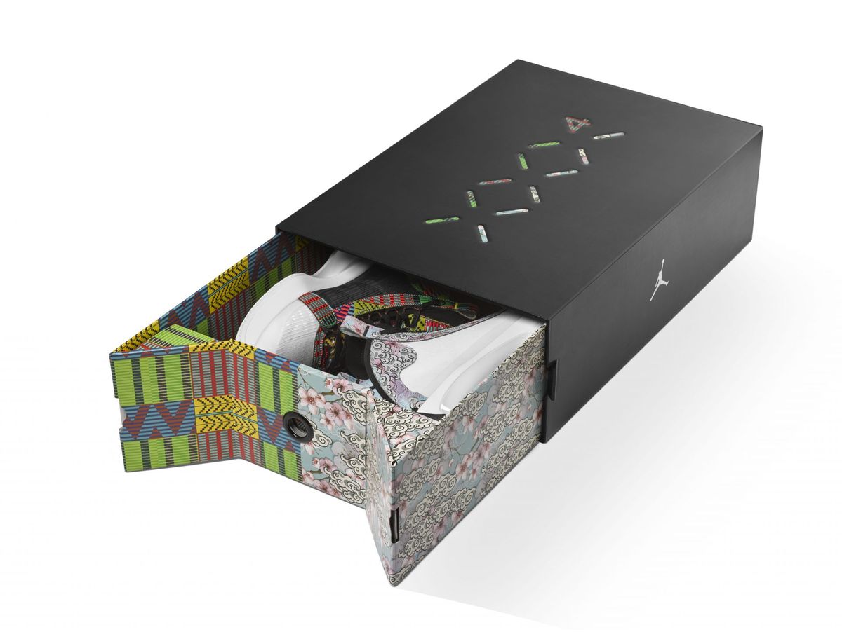 左右が異なるデザインとなっている「エア ジョーダン 34 PE」は、アッパー左側はアフリカのテキスタイルプリントを、そして右側は日本の伝統美術を思わせるプリントが施され、八村のルーツであるベナンと日本を表現。また、シュータンの裏側にはベナンと日本のそれぞれの国旗があしらわれ、アウトソールも両国からインスピレーションを受けたパターンが特徴的だ。