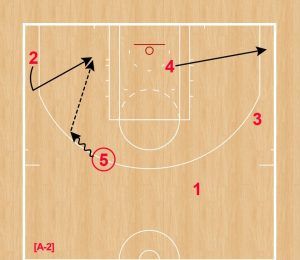 ④は右コーナーへカットして、ペイント周辺にスペースを作る。広い左サイドで⑤と②はハンドオフ(2メンゲーム)。②はディフェンスの状況を見てバックドアカットし、⑤からのパスでシュートを狙う。