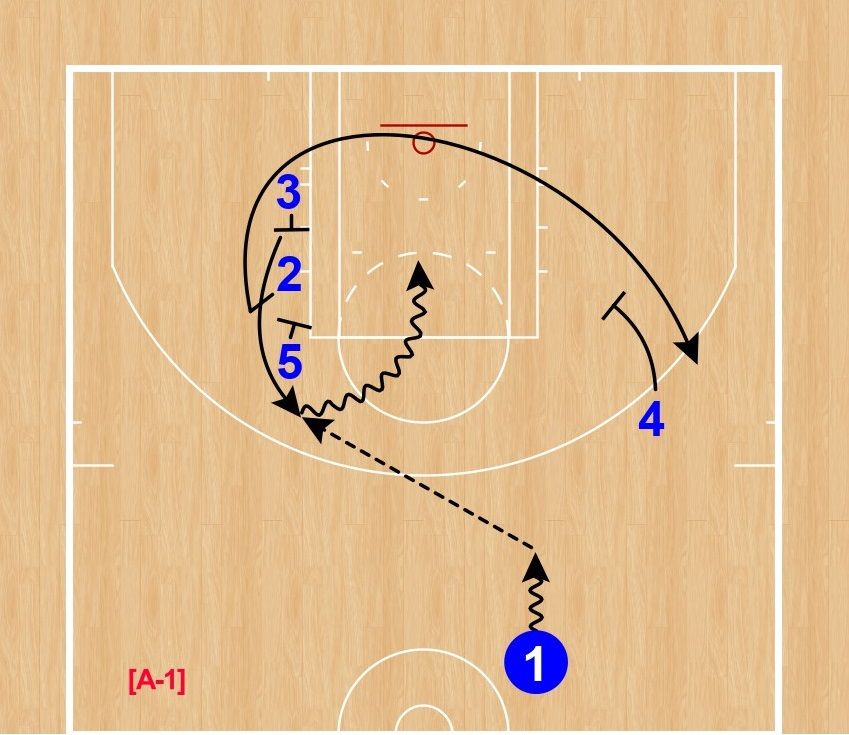 ⑤がダウンスクリーン、③がバックスクリーンをセット。②はトップ方向にフェイクをしてから③を使ってボールサイドに。そのまま④のダウンスクリーンでウイングへカットオフ。すぐに③は⑤のダウンスクリーンを使ってエルボーへカットし。①からのパスをレシーブして、ドライブする。