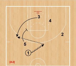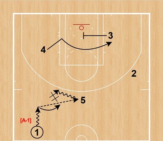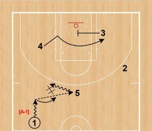 ①は⑤へパスし、⑤と①でDHO。④は③のクロスコートスクリーンでペイント内へカットする。