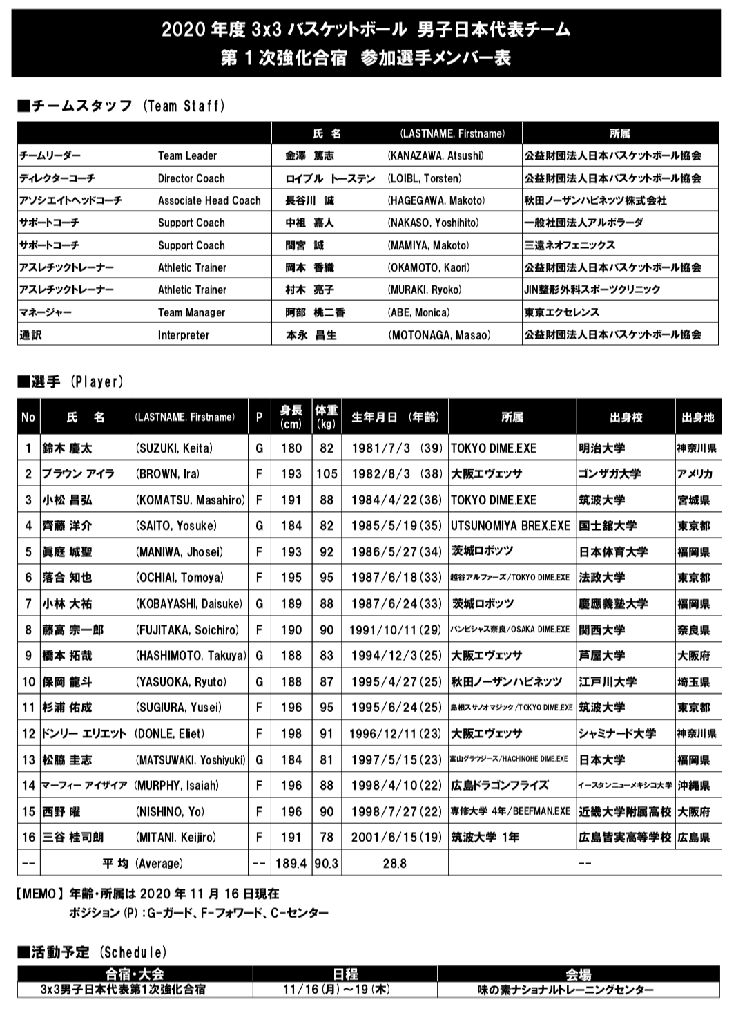 今回の強化合宿にはBリーグの各クラブに所属する選手を中心に総勢16名が参加。10月に行われた「3x3 JAPAN TOUR 2020 Extreme Limited」ファイナルシリーズのMVPで、今合宿最年長、39歳の鈴木慶太から最年少は筑波大1年の三谷桂司朗(19歳)まで幅広い年代の選手を招集した。