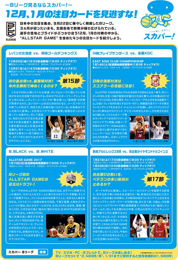 交流戦や『ALLSTAR GAME 2017』『EAST ASIA CLUB CHAMPIONSHIP』など、この時期ならではの注目カードが目白押しのBリーグ。 月刊バスケットボール2017年2月号では、“スカパー!”が放送する試合の中から厳選した4カードを紹介していますが、気になる試合はまだまだあります。 テレビ観戦するなら、今すぐ“スカパー!”のホームページ https://sports.skyperfectv.co.jp/bleague/ をチェック!