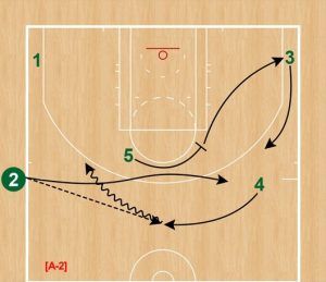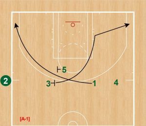 ①は③のスクリーンで左コーナーへカット、③はそのまま⑤のスクリーンで右サイドへ。
