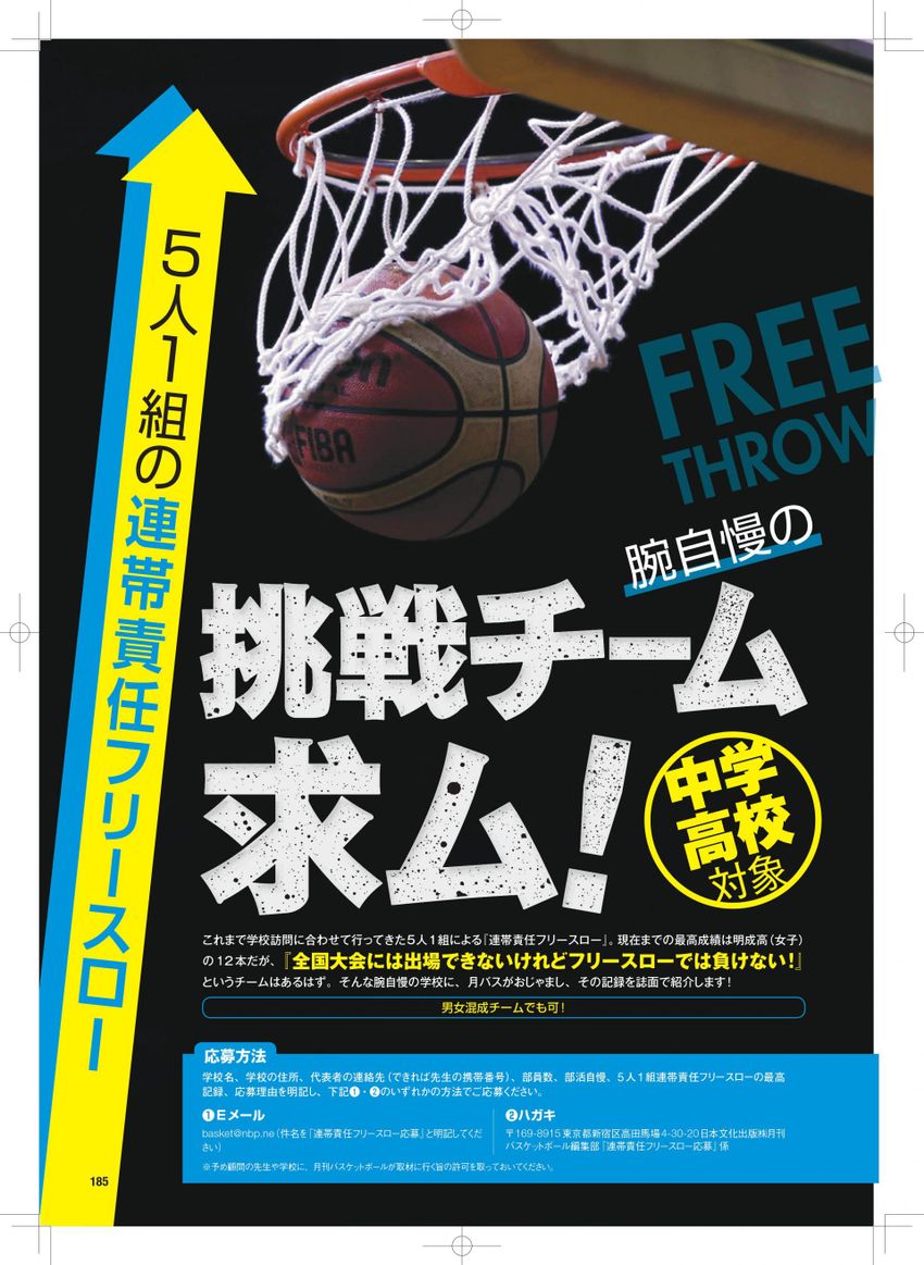 応募はもちろん、質問も受け付けているので、ドシドシご連絡ください! 【応募方法】 学校名、学校の住所、代表者の連絡先(できれば先生の携帯番号)、部員数、チーム自慢、5人一組連帯責任フリースローの最高成績、応募理由を明記の上、 ①Eメール basket@nbp.ne.jp (件名に「連帯責任フリースロー応募」と明記してください) ②ハガキ 〒169-8915 東京都新宿区高田馬場4-30-20 日本文化出版 (株) 月刊バスケットボール『連帯責任フリースロー応募』係 いずれかの方法でご応募ください。 ※あらかじめ顧問の先生や学校に、月刊バスケットボールが取材に行く旨の許可を取っておいてください。
