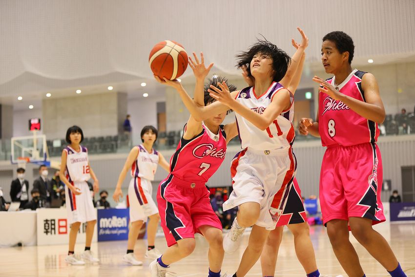 一方の日本体育大学桜華中学校は、#4世森が力強いドライブを見せただけでなく、リング下の#8山田に的確なパスを供給することで対抗。さらにこの日3本の3Pシュートを決めた#5中村も20得点をたたき出し、Earnestに食らいついていた。