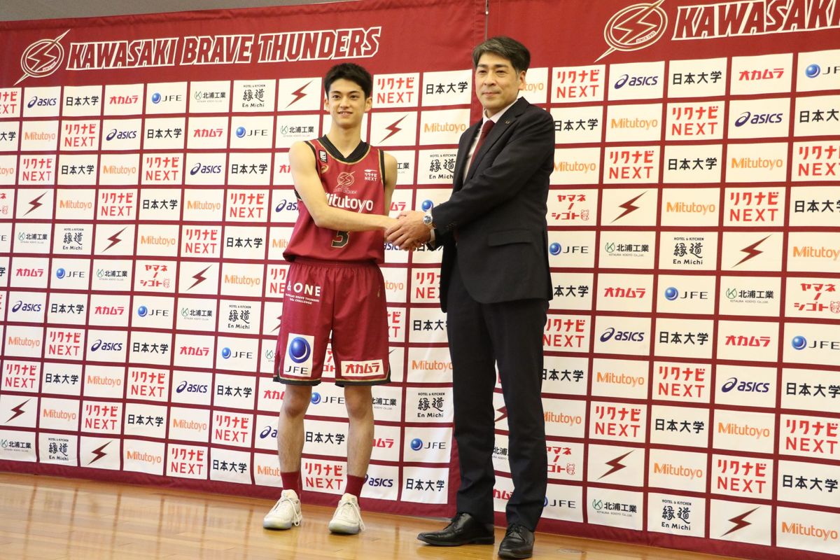 1950年のクラブ創部以来、現役高校生をチームに迎え入れるのは川崎にとって初めてのことだ。北卓也GMは「ディフェンスを翻弄するパスセンス、パス1本でファストブレイクを出すプレーなどたくさんの魅力があります。見ている方々を興奮させるプレーヤーだと思っています」と米須を評すると共に、加入の経緯について「2019年をウインターカップの準決勝(福岡第一戦)を見ていて、当時の注目選手は河村勇輝選手(東海大1年)だったのですが、東山にパスがうまい子がいるなというのが私が映像越しで見た米須選手との初対面でした。その後いろいろな情報を集め始めて、昨年のウインターカップ京都府予選の前に大澤(徹也)先生に連絡をして、(他のクラブから)特別指定選手などの声掛けがあるのかを確認しました」と説明。
