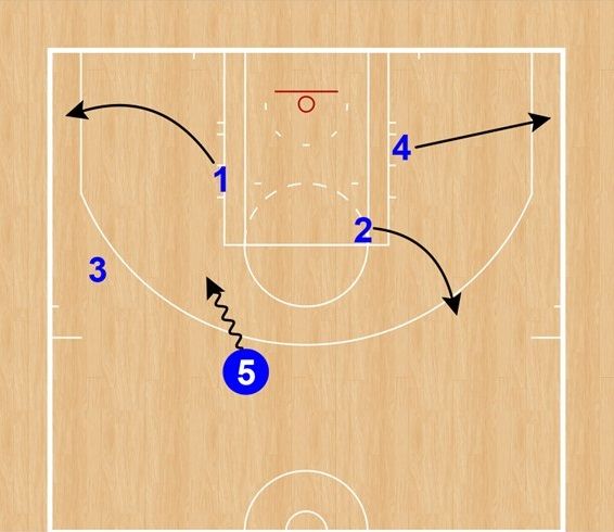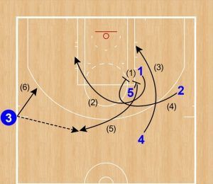 ①は⑤のダウンスクリーンでカット、続けて④もペイント内へカット。②はボールサイドへカットしながらカールして、⑤へダウンスクリーンをセットする。⑤はトップで③からのインバウンズパスをレシーブ。