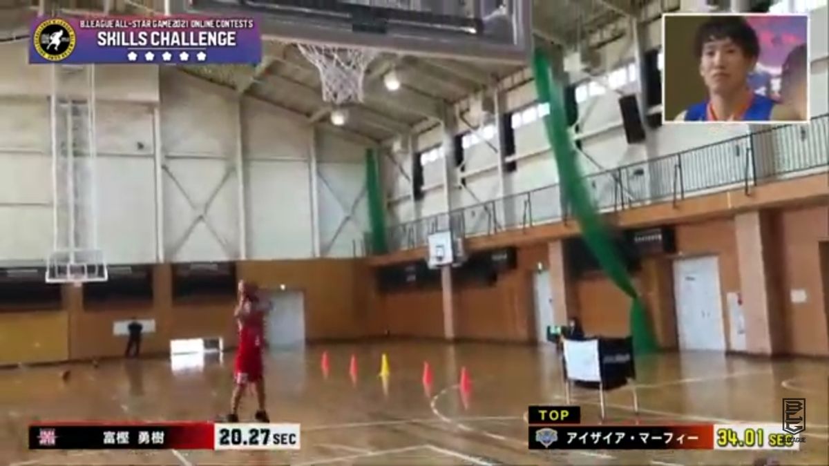 オンラインコンテストは、ここまではBリーグ公式YouTubeで無料配信されていたが、次のスキルズチャレンジからはバスケットLiveに移行して進んだ。ドリブル、パス、ショットの正確さとスピードを競うこのゲームにエントリーしたのはアイザイア・マーフィー(広島ドラゴンフライズ)、並里 成(琉球ゴールデンキングス)、篠山竜青(川崎ブレイブサンダース)、富樫勇樹(千葉ジェッツ)、多嶋朝飛(レバンガ北海道)の5人と、アダストリアみとアリーナにゲストとして招かれていた平尾の6人だった。