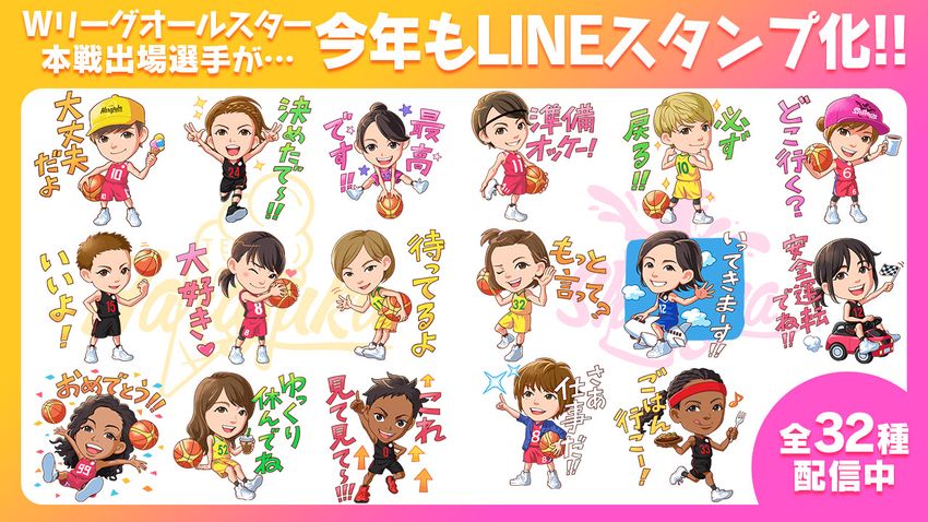 Wリーグから公式LINEスタンプ「Wリーグ オールスタースタンプ 2021」が発売となった。前回のオールスターに引き続き、女子バスケットボール漫画家「歩(あゆみ)」さんがオールスター選出選手のキャラクターを描いている。