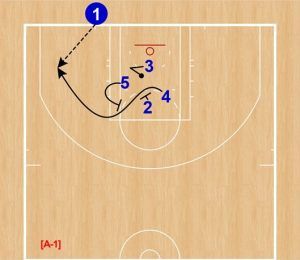 ①がインバウンダーで、ペイント内に③・⑤・④・②が固まって立つところからプレーはスタートする。