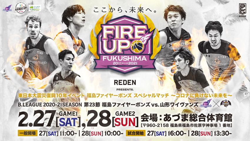 2021年3月11日(木)で東日本大震災から10年。震災を契機に誕生した福島ファイヤーボンズが、2月27日(土)・28日(日)にホームのあづま総合体育館で行われる対山形ワイヴァンズ戦の会場で、『FIRE UP! FUKUSHIMA』と銘打って東日本大震災復興10年イベントを開催する。