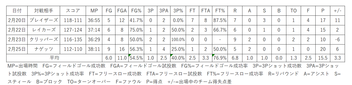 八村の西海岸遠征における成績