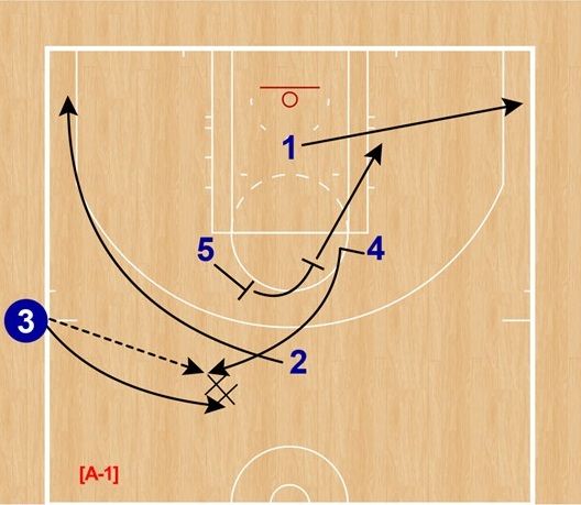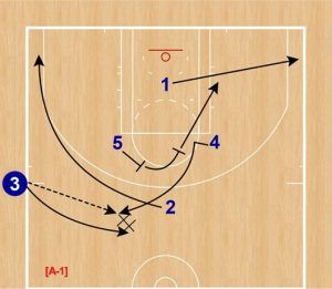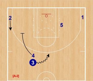 ②は⑤のスクリーンでコーナーへカット。続いて⑤のダウンスクリーンで④がトップへカットし、インバウンズパスをレシーブする。①はコーナー、⑤はダンカースポットへカットし、③と④はそのままハンドオフ。