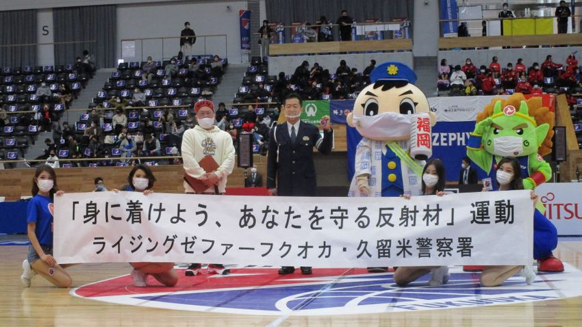 この反射材は選手とスタッフも着用することから、ブースターがごく自然にチームの一体感を共有して「身に着けたい」と感じられるアイテム。2月27日・28日に久留米アリーナで行われたB2公式戦・対ファイティングイーグルス名古屋戦では、『「身に着けよう、あなたを守る反射材」運動』と題し、ティップオフ前にチアリーダーのRsunZ、チームマスコットの神くん、MC担当U-LAW、久留米警察署員、福岡県警察マスコットキャラクターふっけい君とともにセンターコートに立った福永課長が、ブースターに反射材の有効性について訴えるとともに、コラボ反射材を両日とも1000個(合計2000個)配布する反射材着用キャンペーンを実施。県民、市民を交通事故から守りたいという願いが込められたコラボレーションに、ブースターからも大好評を得ていた。