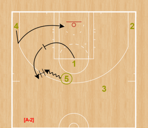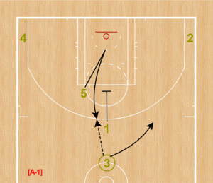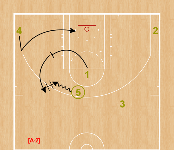 ⑤は①のダウンスクリーンを使って、トップで③からボールをレシーブ。③は右サイドへカットしてスペースを作る。