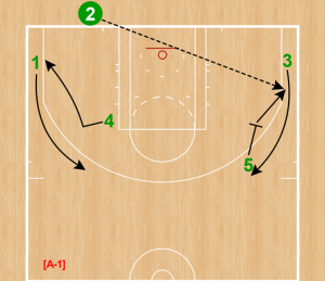 このプレーは両側でダウンスクリーン後、続けてバックスクリーンで①・③をリングに近い部分でボールレシーブさせることが本来の形である。
