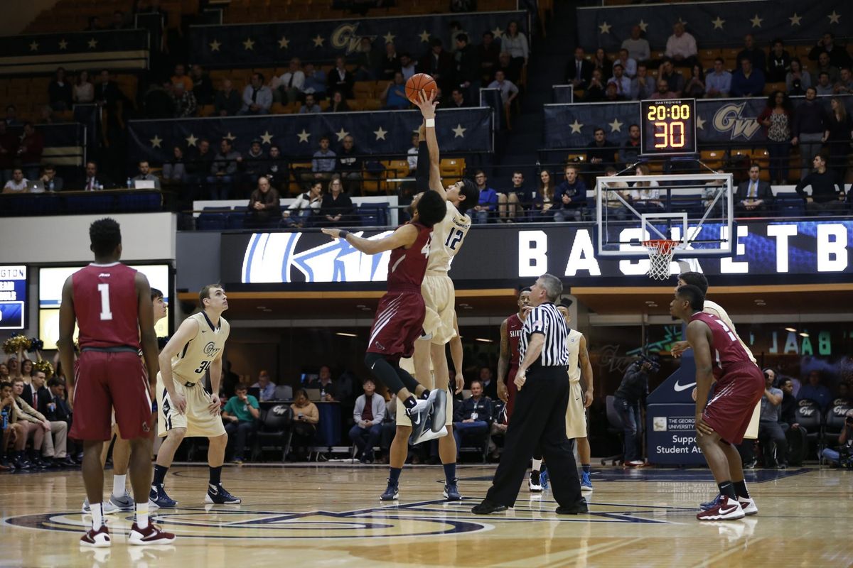 2016年2月10日のジョージ・ワシントン大対セント・ジョセフ大戦のティップオフでボールを競う渡邊とベンブリー