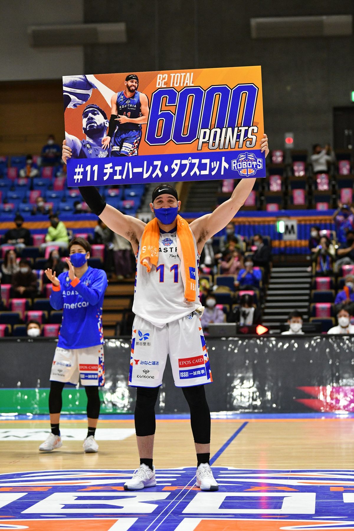 茨城ロボッツのパワーフォワードを務めるチェハーレス・タプスコットが、史上初のB2個人通算6,000得点のマイルストーンに到達した。4月17日に行われた第31節、対仙台89ERS戦を前にあと8得点に迫っていたが、この試合の第1Qで7得点を奪うと、続く第2Q残り2分50秒に右ミドルポストからゴールを背にしてドリブルでディフェンダーを押し込み、柔らかくレイアップを沈めて6,001得点目を奪った。
