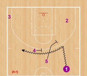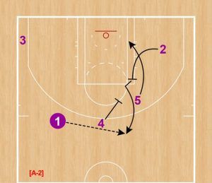 セカンダリーブレイクからそのままオフェンスに入っていく形(ホーンセットからでも可能)。①がボールキャリー、③・②が両コーナー、④・⑤が3Pライン上にダブルドラッグをセットした状態からスタートする。
