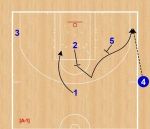 ②がバックスクリーンをセットし、①がペイントへカット。⑤がフレアスクリーンをセットし、②はそのまま右コーナーへカット(スクリーンスクリナー)。④からのパスをレシーブして3Pシュートを決めた。