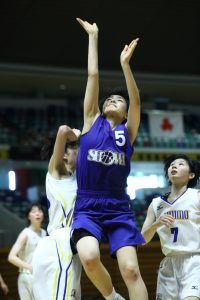 1Qは一進一退の攻防を見せ、21‐19と八雲学園がわずかにリード。2Qの序盤までその流れが続いたが、26‐26の同点から昭和学院の♯5石橋花穂が3Pシュートを2本連続で決めて32‐26とリードを奪う。八雲学園のタイムアウト後も昭和学院は守りを固めつつ攻撃の手を休めず、前半を終えて昭和学院が49‐34とリードを奪った。