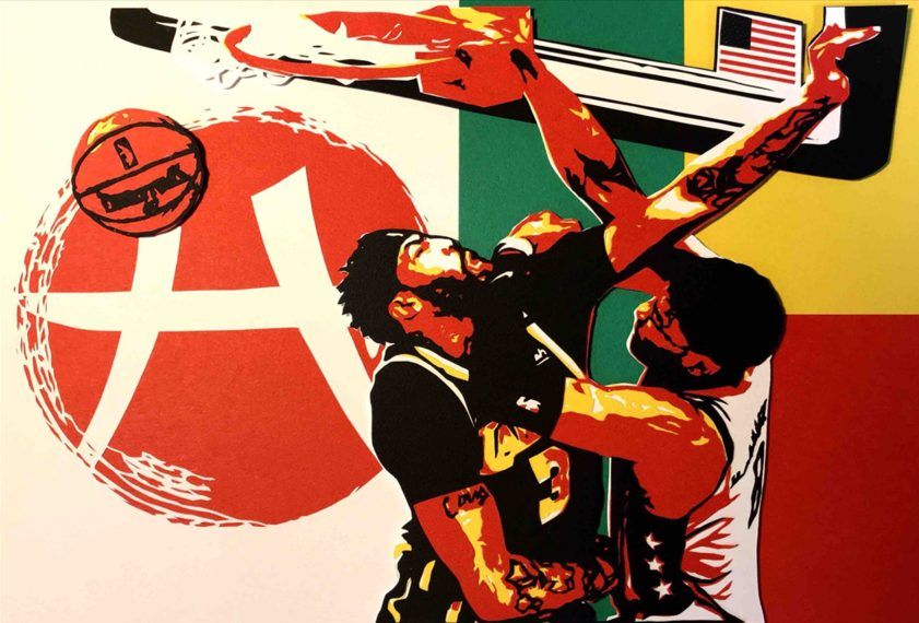ハイライトにもなったこのダンクは見たその日からすぐに準備に取り掛かるほど制作意欲の湧くシーンでした。他の作品とは少しデザインを変えて背景を八村選手のルーツである日本とベナンの国旗をモチーフに、更にシグネチャーロゴも落とし込みました。背景と本体を重ねた時に境界が曖昧になってしまったので本体を少し浮かせて固定しています。