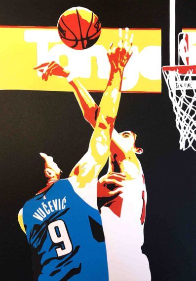 元オーランド・マジックのオールスター、ニコラ・ブチェビッチ(現シカゴ・ブルズ)をクリアブロックしたシーンです。この作品はこれ以降の作品の配色やレイヤー数などのベースとなった作品です。シンプルさと抽象的な実写のリアルさをカッコいいと思えるバランスでデザインすることを心掛けています。