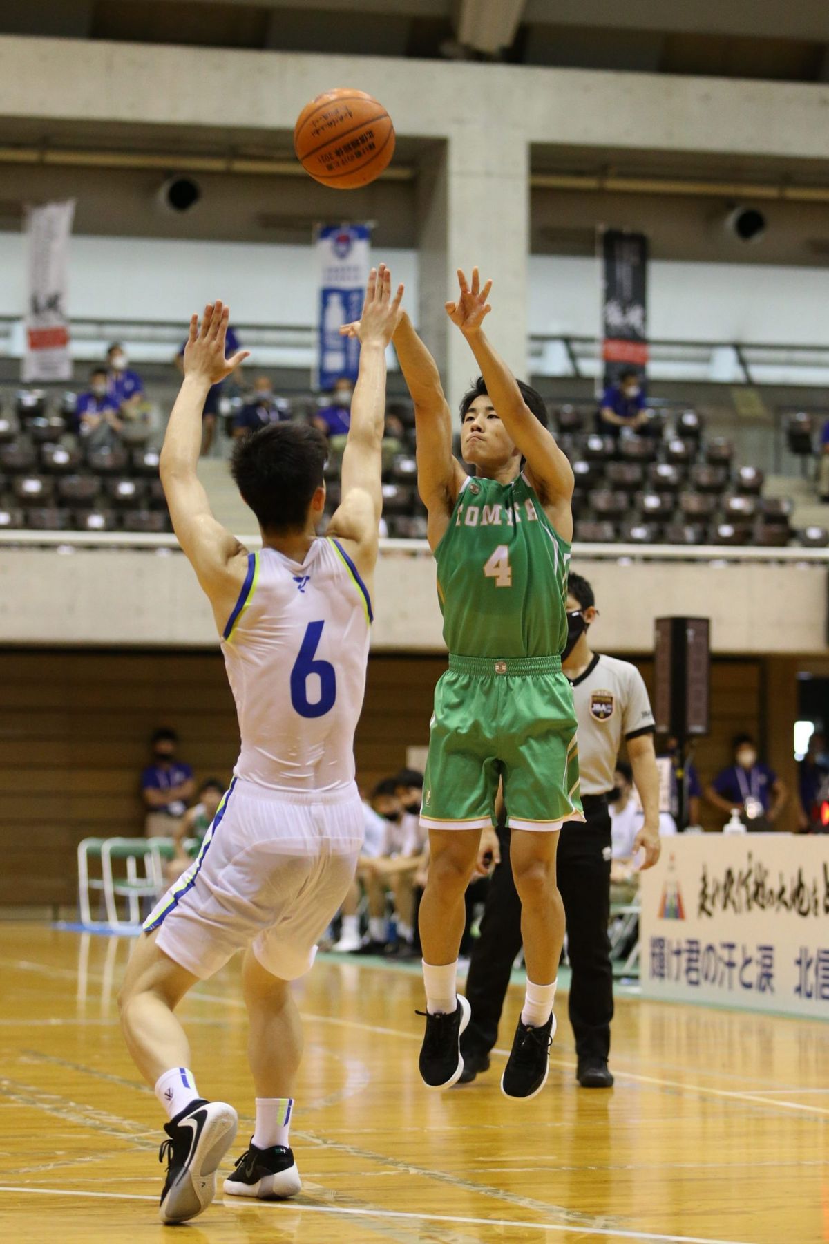 そう語ったのは富田の村田竜一コーチ。初のインターハイ出場となった同校は、今大会で粘り強さに定評のある豊見城を撃破し、2回戦で帝京長岡と対戦。序盤こそリードを奪う好勝負を演じたが、前半は5点のビハインド。後半は#5高橋快成のスコアや#4植田碧羽が意地の3Pシュートを見せるなど、最後まで食らい付いたがついには18点差(68-86)の敗北を喫した。