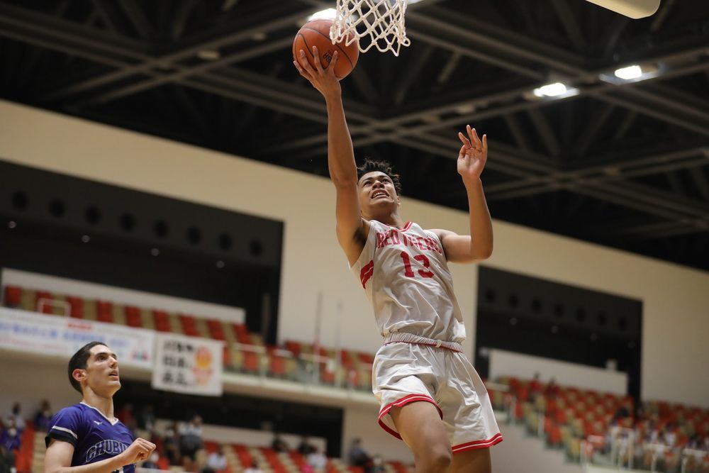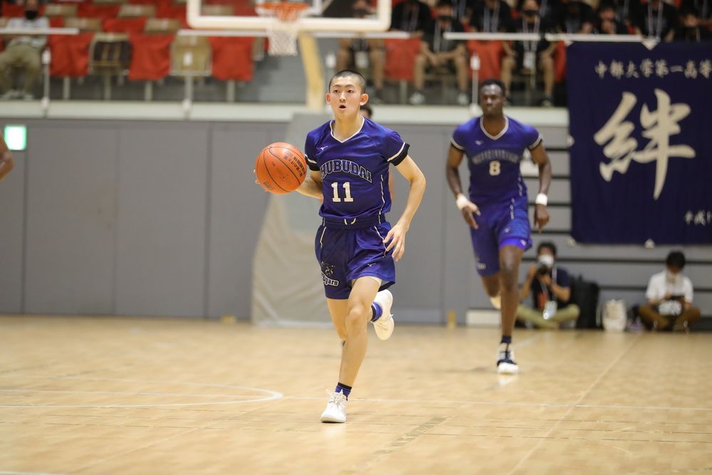 試合は、1Qこそ互角の戦いとなったが、2Qは完全に中部大第一ペース。今大会でケガから復帰したスピード抜群の司令塔#11下山瑛司を起点に#5福田健人らが果敢に攻め、インサイドでは#8アブドゥレイ・トラオレ、#7田中流嘉洲が高さとフィジカルの強さを生かしてリバウンドを掌握する。対する開志国際は#6白澤朗が1回戦で負傷して戦線離脱したこともあり、インサイドがやや手薄。ゾーンディフェンスで中を固めたものの2Qのスコアだけ見れば9‐29と中部大第一に一方的にリードされてしまった。