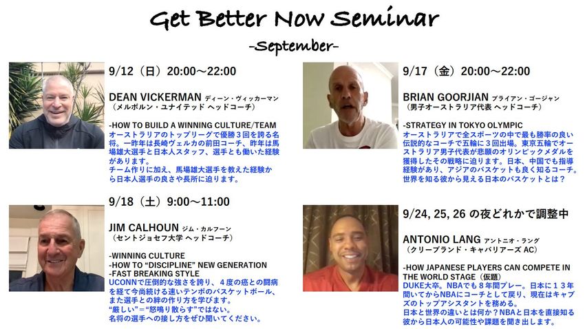 昨シーズンまでB2のアースフレンズ東京Zで指揮を執った、東頭俊典氏が運営するバスケットボール・コーチング・ウェビナーの最新情報が送られてきた。2021年9月中に海外のトップコーチを招いて、『Get Better Now Seminar(以下GBNセミナー)』のタイトルで4回のウェビナーを開催するという。