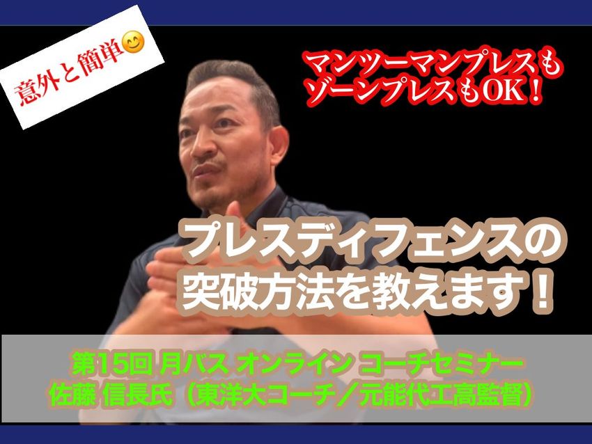 第15回は、佐藤信長氏(東洋大コーチ/元能代工高監督)が登場! 10月10日(日)20:00~ZOOMミーティングによるオンラインセミナーを開催する。テーマは“プレスディフェンスの突破方法”などについて。「簡単な準備や心構えを少しするだけで、マンツーマン(もしくはゾーン)プレスは恐くない」と、佐藤氏。高校生やBリーグでの指導経験もあり、自らもトップリーグでガードとしてプレーした経験を生かしたアドバイスが盛りだくさん! 詳しくは明日以降のインタビューや動画でCHECK!(※次回はJBAリフレッシュ研修会ではありません)