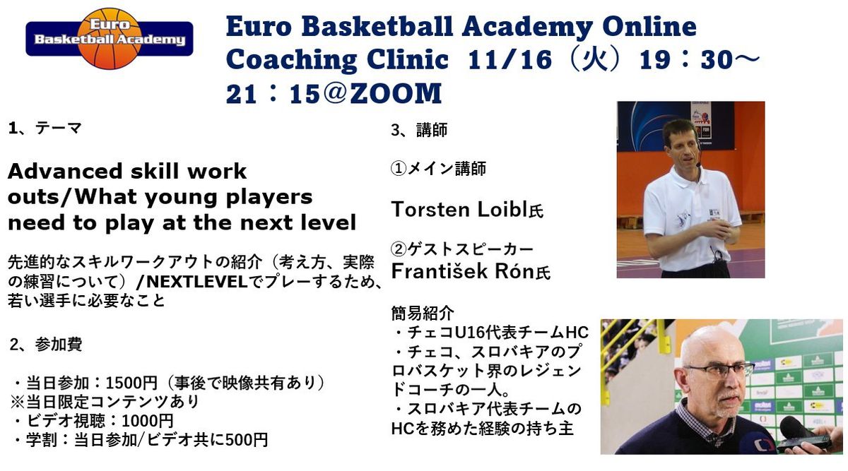 11月16日(火)19:30~21:15、トーステン・ロイブル氏がZoomでのウェビナー「Euro Basketball Academy Online Coaching Clinic」を開催する。