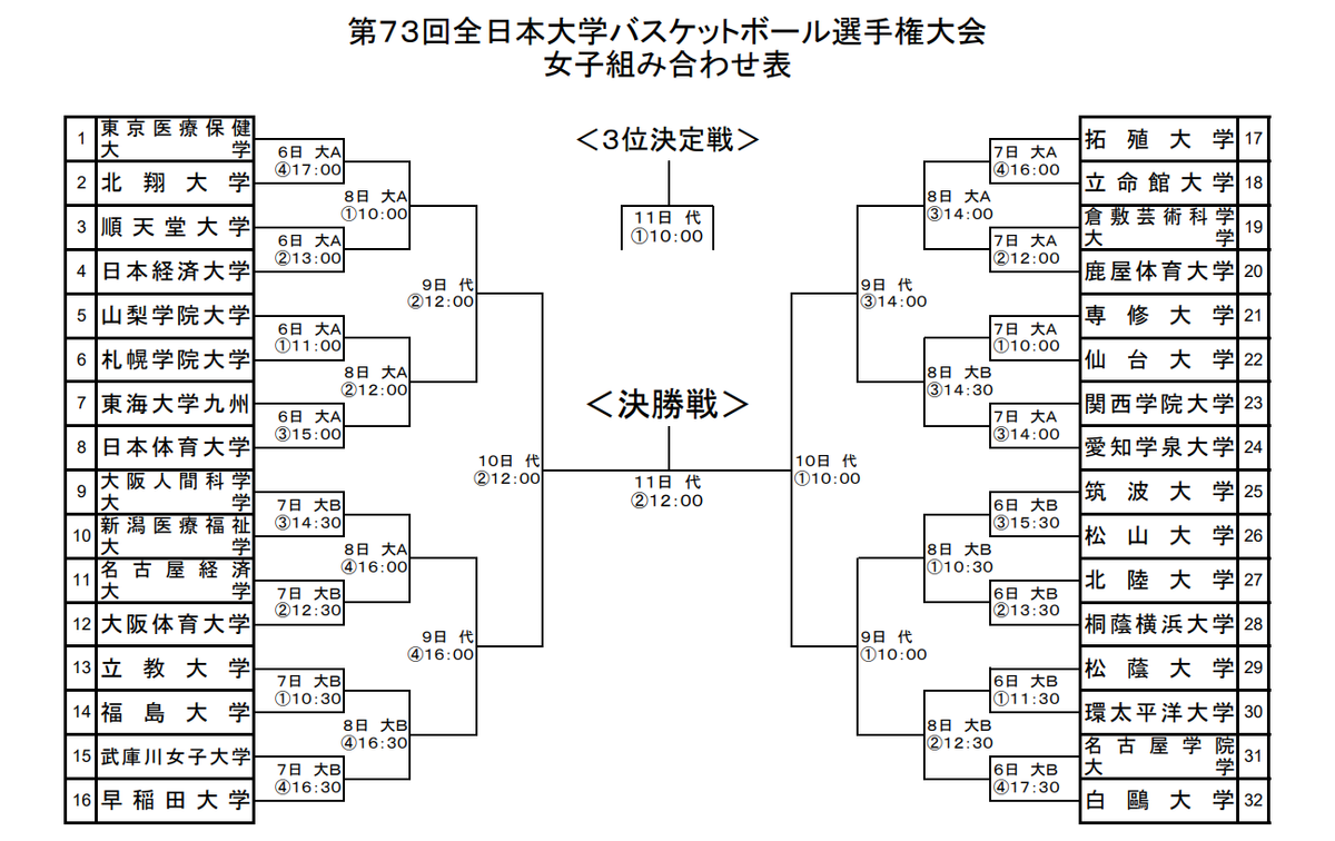 第73回全日本大学バスケットボール選手権大会の組み合わせ・競技日程が発表に